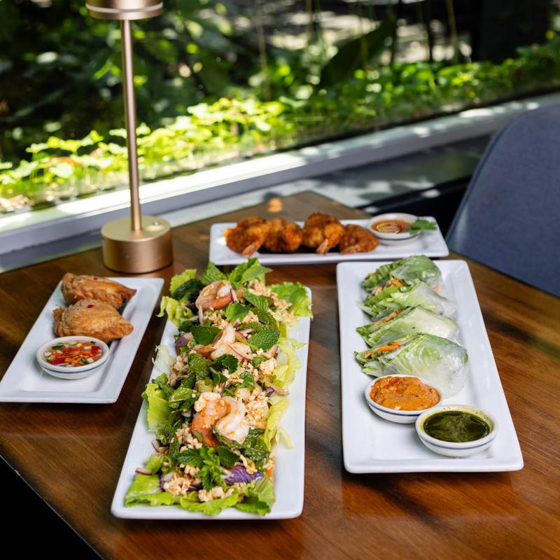 The interior of this restaurant is beautiful. It's a warm and magical atmosphere with great lighting, involvement of plants and unique fixtures. They have a nice courtyard in the back with a patio and lots of plants. The service was kind and well timed. The food was also delicious. The Tom yum fried rice was a particularly nice twist!
